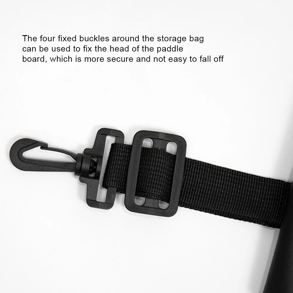 4. Secure Fastening System: Equipped with four fixed buckles around the storage compartment, the storage bag provides a secure fastening system. This feature is particularly useful for securing the paddle board's head, ensuring a firm attachment and preventing accidental detachment.