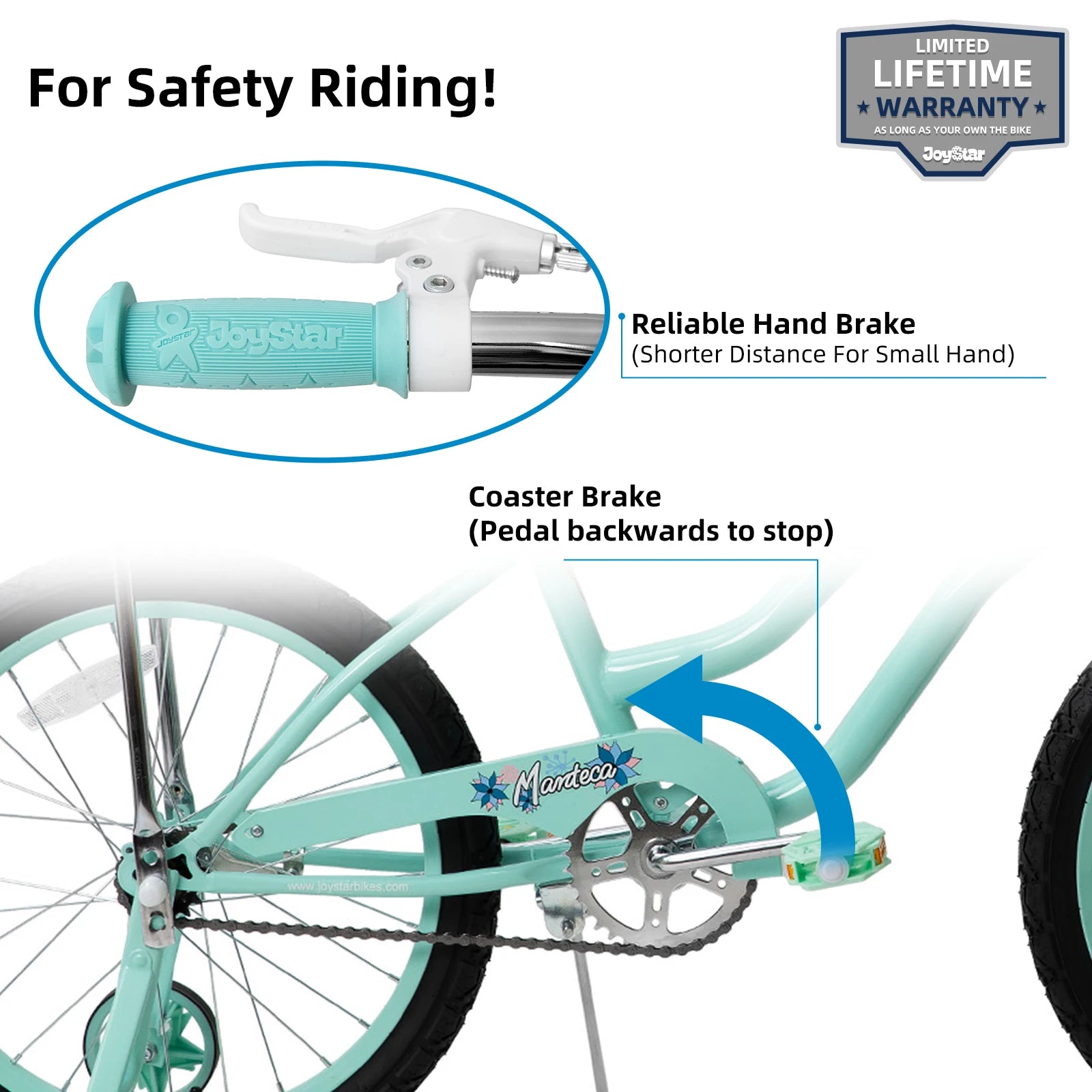 Front Caliper & Rear Coaster Brake This girls bike is equipped with front caliper brake and rear coaster brake. Handbrake and foot brake both provide precision speed control, offering double safety protection. |