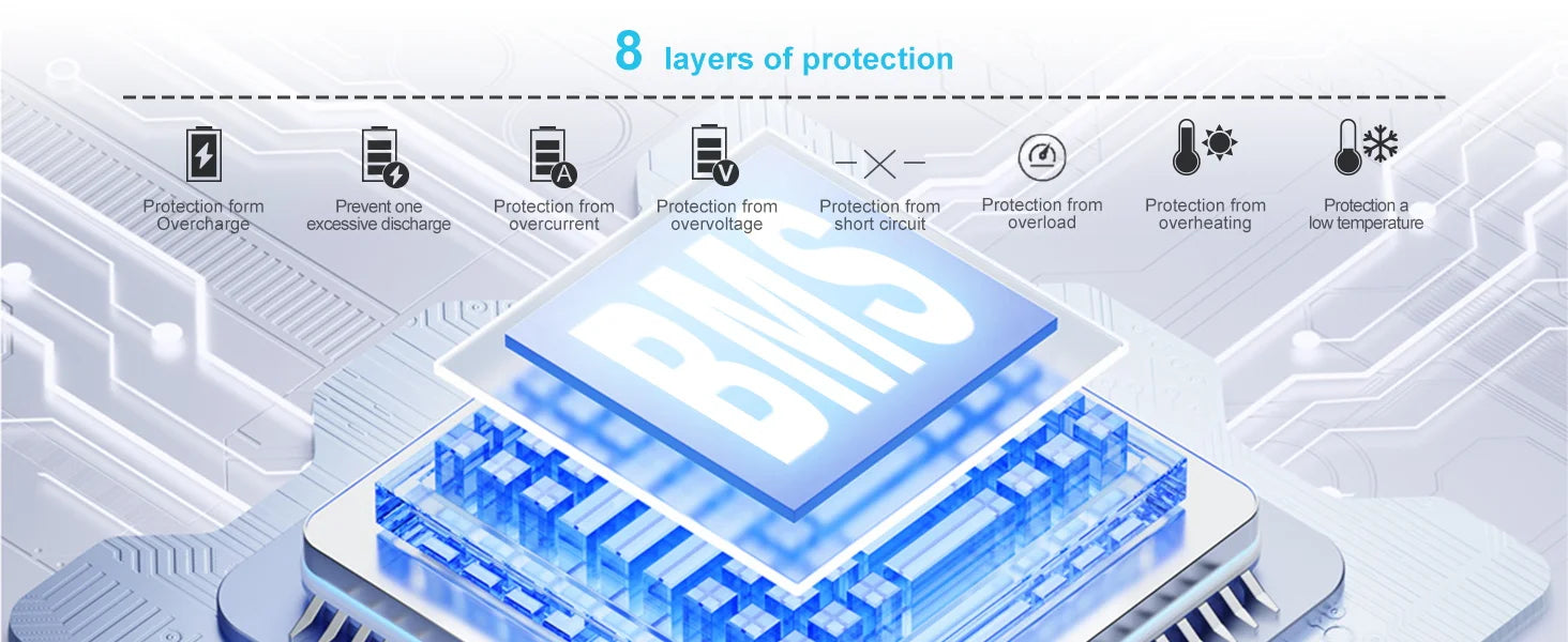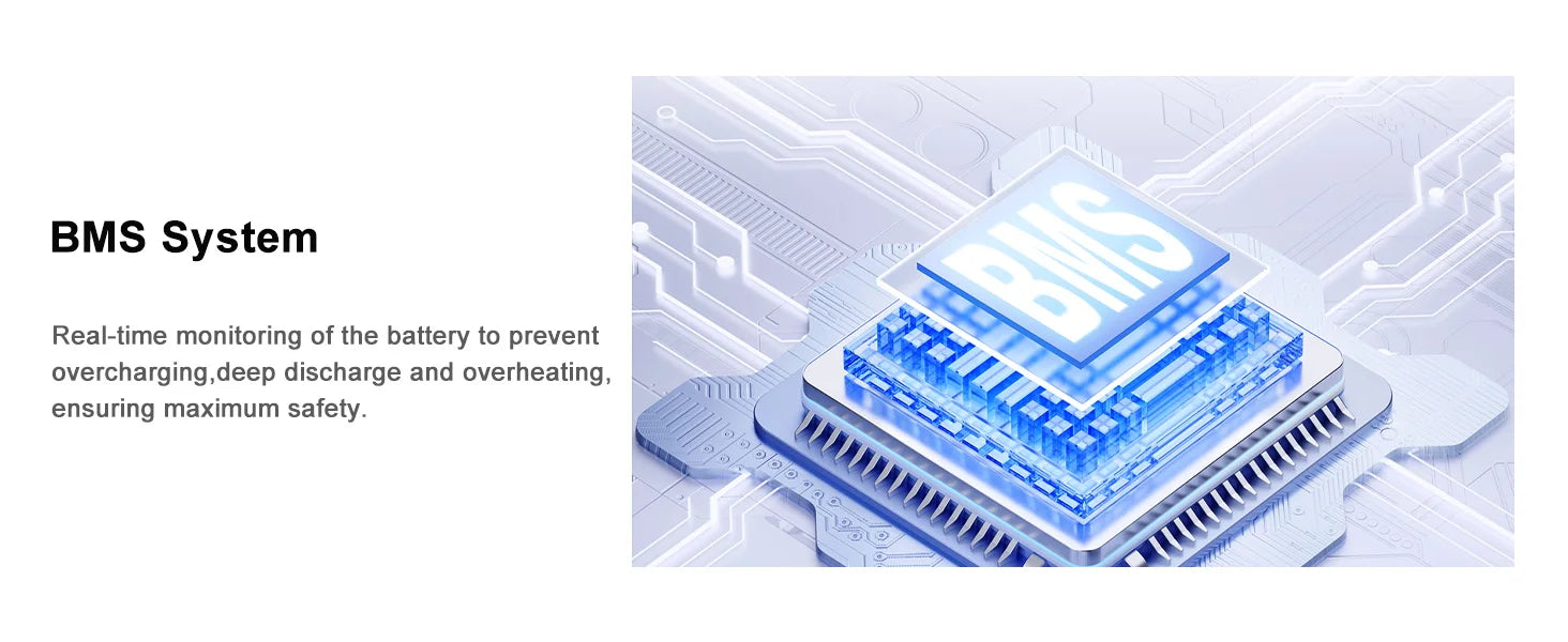 Real-time monitoring of the battery to prevent overcharging,deep discharge and overheating, ensuring maximum safety.