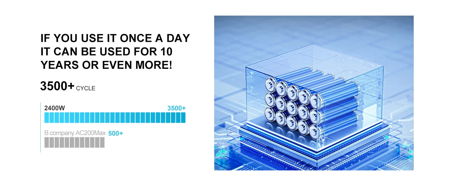 The built-in battery is made of a lithium iron phosphate battery (LiFePO4), which lasts with over 3500 charge/discharge cycles (10 years). The service life is seven times longer than conventional batteries and costs less.