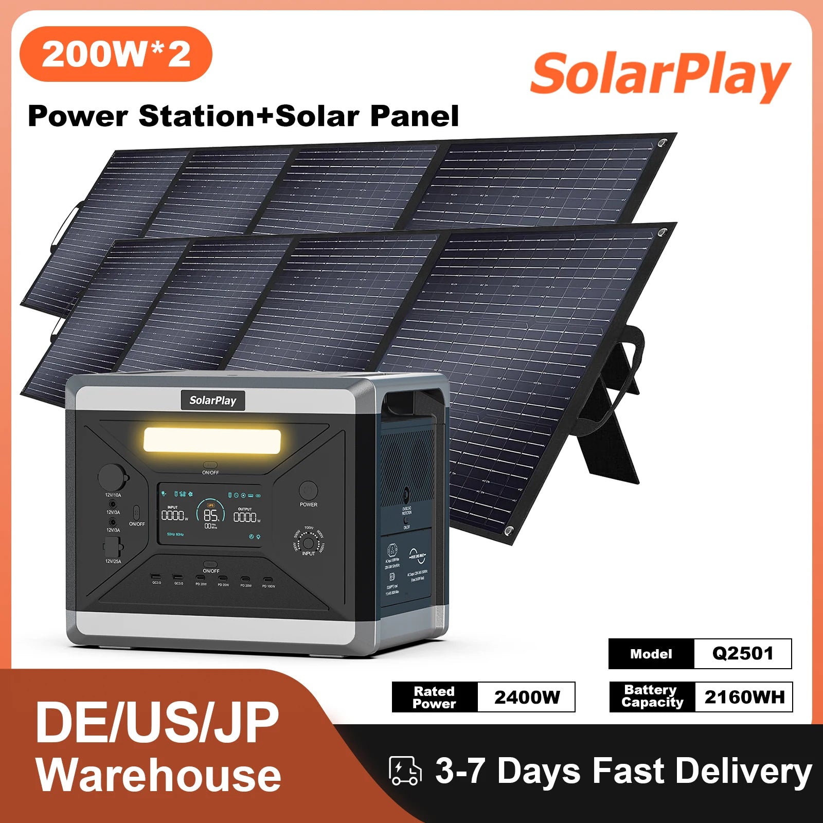 SOLARPLAY 2400W/2160Wh Power Energy Stations Portable Q2501 Rechargeable Batteries Hiking Solar Panels 200W Foldable for Outdoor