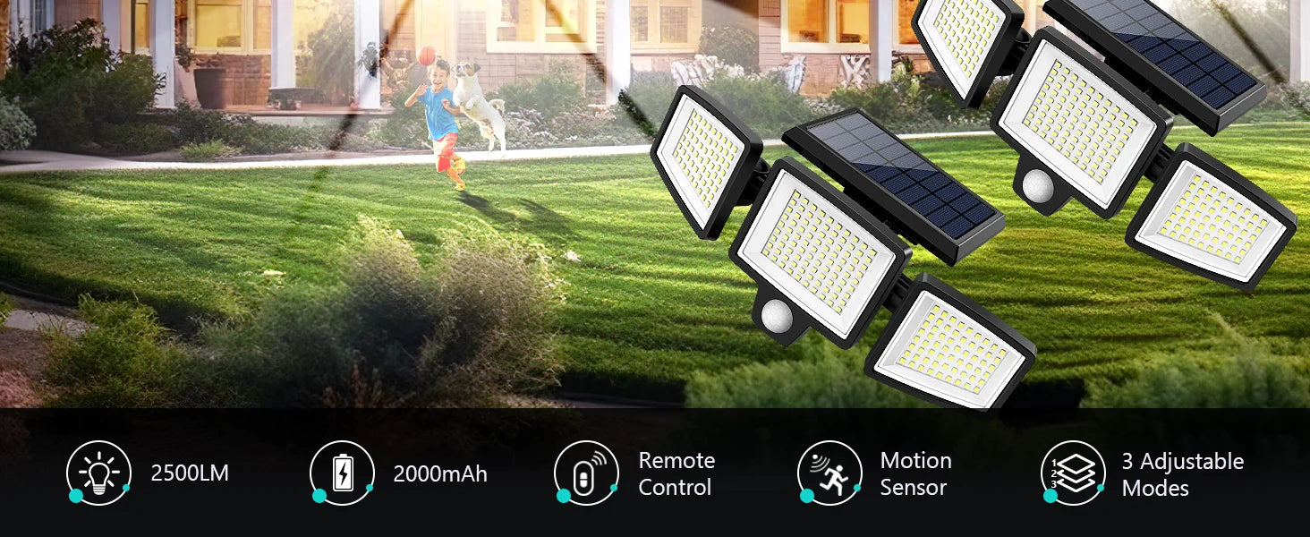 【Super Bright Solar Motion Sensor Lights】:The solar outdoor lights equipped with 210 super bright LED beads, produce up to 2500 lm 6500 K high brightness output and good heat dissipation. Perfectly illuminate your courtyard, garage, swimming pool.