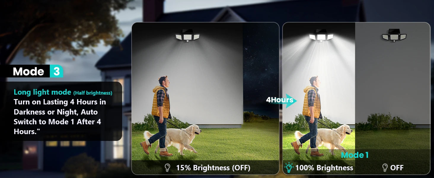 【Wide Angle Illumination & PIR Motion Inductor】:3 adjustable heads design can horizontally. With innovative wide-angle and intelligent induction control, solar flood light detects up to 270 ° wide lighting angle and 26 feet sensing distance,which can provide extra brightness and more visible area.