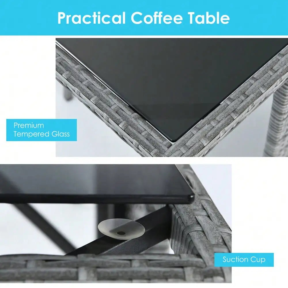 This 3-piece outdoor wicker bistro set will bring more beauty and happiness to your life! Composed of anti-rust steel frame and PE wicker, this rattan furniture set is very stable and can be used for a long time. The soft and comfortable seat cushion and ergonomic backrest give you the ultimate comfort experience and relieve your fatigue to a certain extent. Besides, the practical coffee table with tempered glass allows you to place beverages, cups, snacks and other items, providing convenience for you and your friends to enjoy a comfortable outdoor life. What's more, the modern and beautiful design makes this table and chair set suitable for different places, so you can put it in the living room, patio, courtyard, swimming pool and other places.