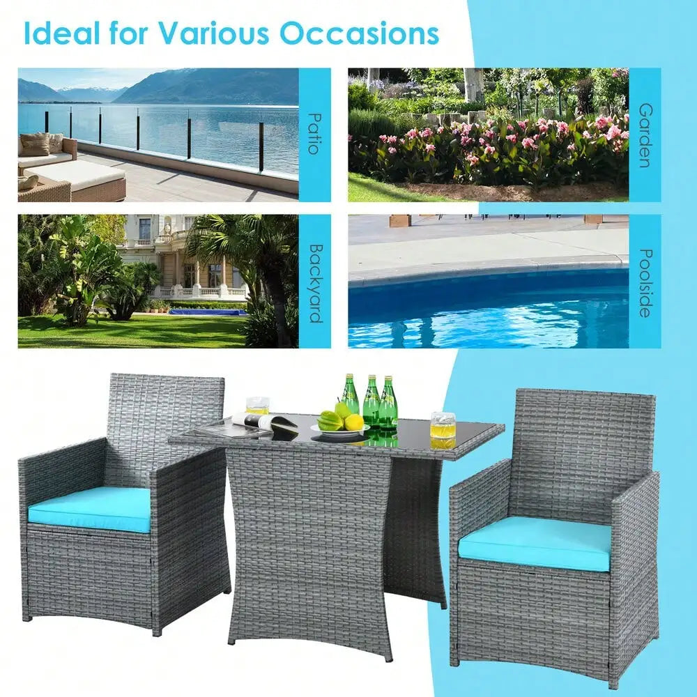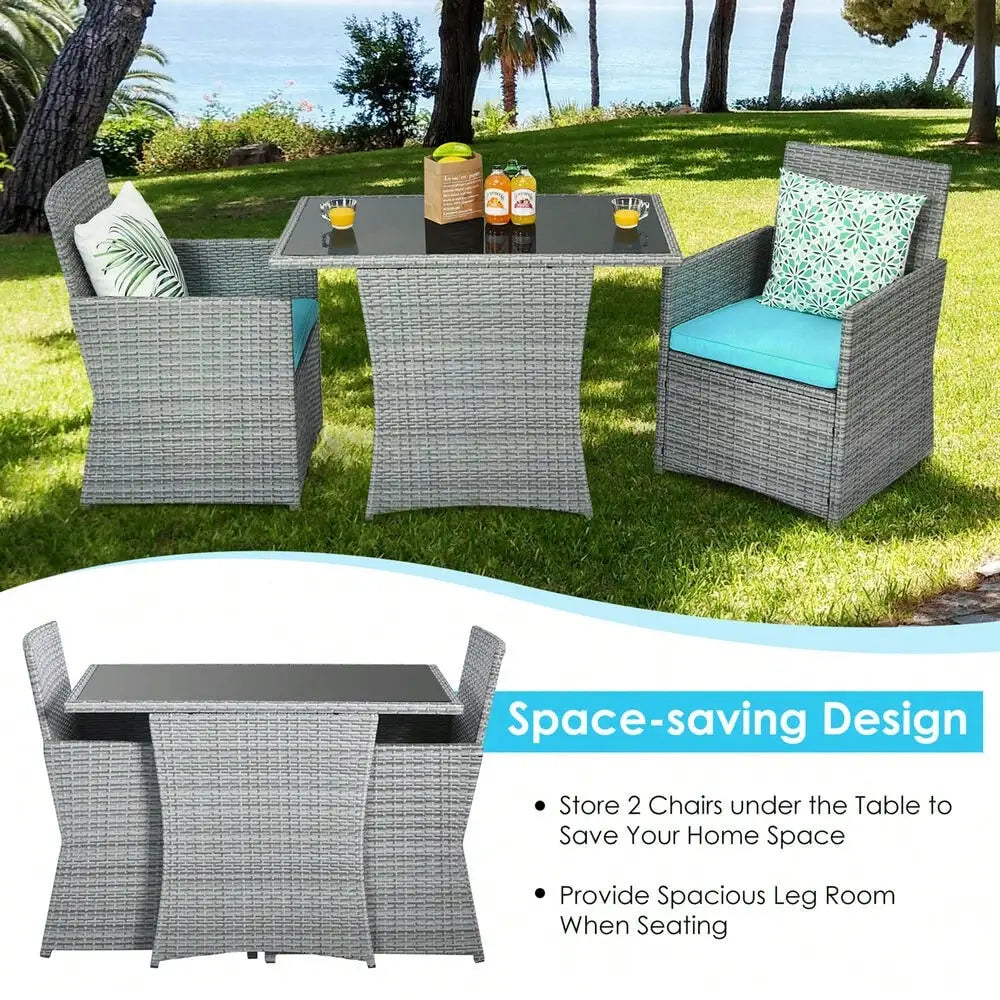 3PCS Outdoor Rattan Conversation Set Patio Dining Table Set w/ Turquoise