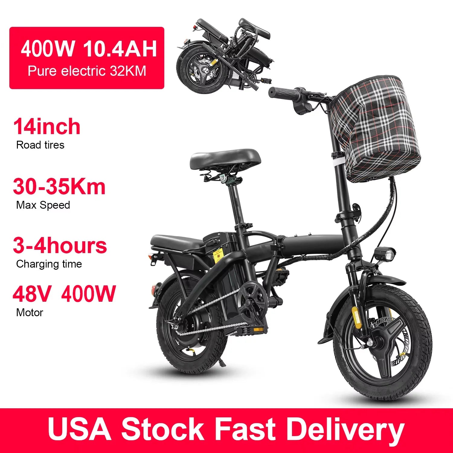 48V400W 10.4AH Foldable Electric Bike Child Dirt Bike E Bike Long Range With Basket Road Bikes