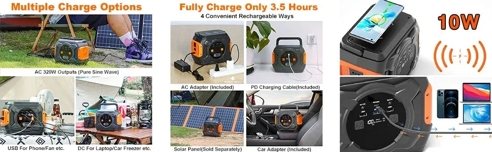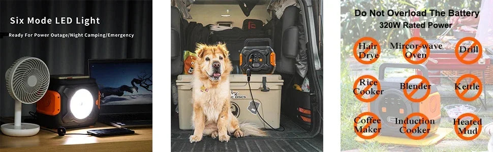 3. Please note that the AC output port can charge devices less than 320W, DC output can charge devices total less than 168W; Once exceeding, this portable power generator will be in protection mode and shut down.
