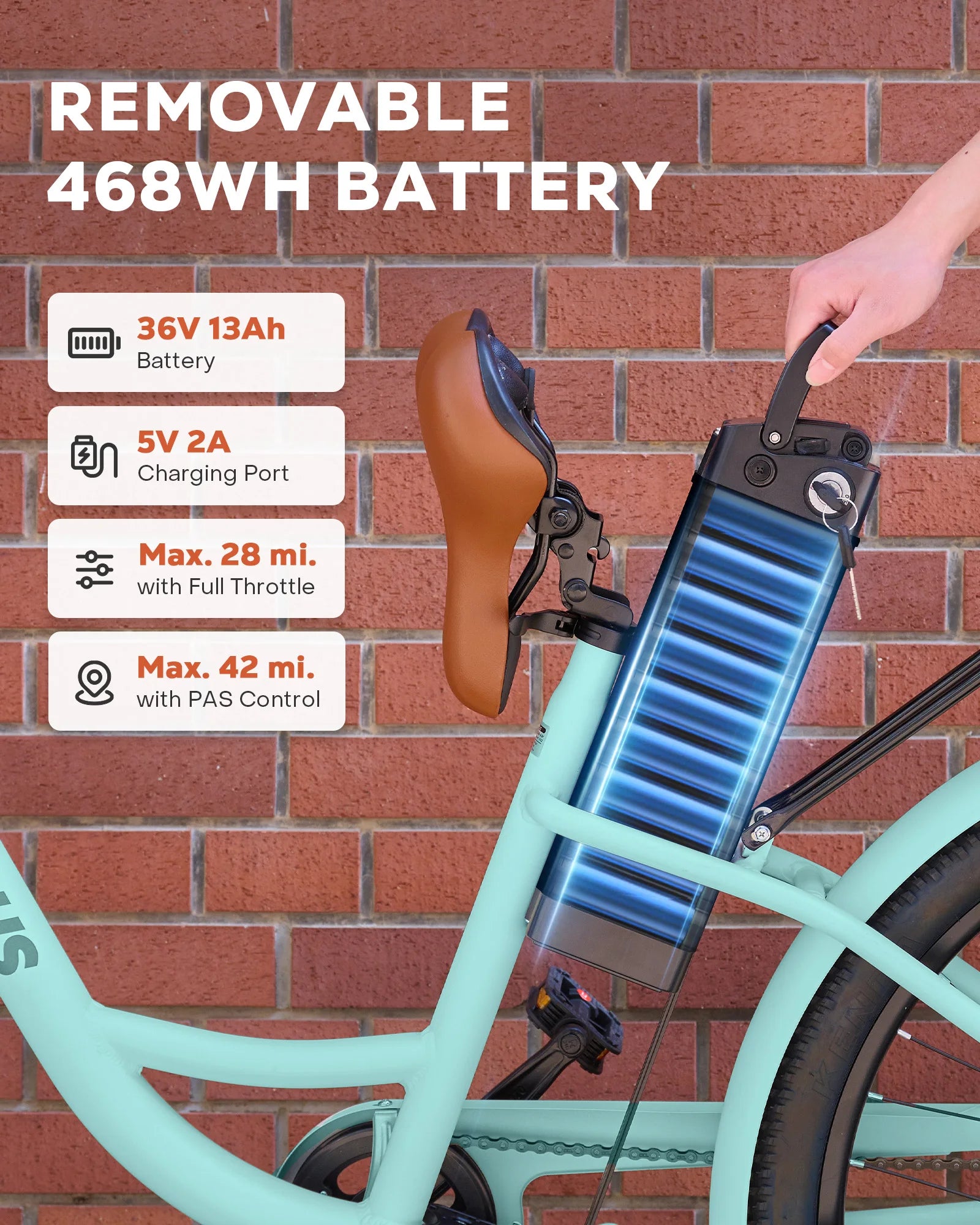 Designed with your comfort and safety in mind, this 7 speed adult electric bicycle boasts a soft leather saddle, large and easy to read digital display, dual disc brakes, waterproof headlight, and anti theft alarm to let you stay comfortable even during long rides and keep your bike secure. The 350W brushless rear hub motor provides powerful and reliable assistance for your journey, while the 36V 13Ah lithium battery is easily removable for fast recharging.