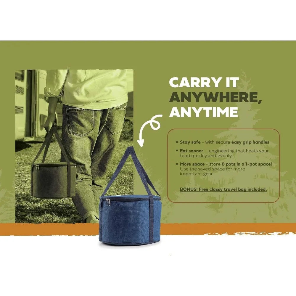 - PRACTICAL, TRAVEL-FRIENDLY- Our pots are highly portable; they come with a handy, lightweight travel bag, and features folding and removable handles for extra space. The lids have easy-grip handles for safe touching when cooking, and are stackable so that you don't have to sacrifice room for other important gear. What's more, the pan features a non-stick coating for mess-free cooking and cleaning.