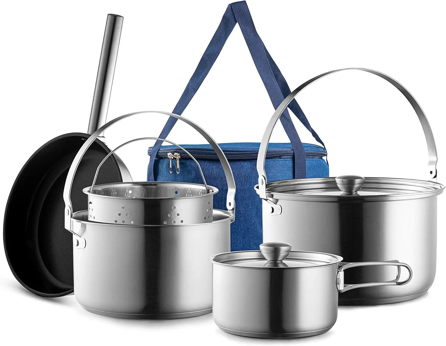 - SUPERIOR STAINLESS STEEL CONSTRUCTION- All our outdoors cooking set's pieces are made with premium 304 Stainless Steel for extra durability and longevity. Feel absolutely free to take our cookware set on your trips and enjoy wholesome meals cooked over open fire, charcoal, wood or gas induction when you hike, camp, or take your RV to the outdoors.