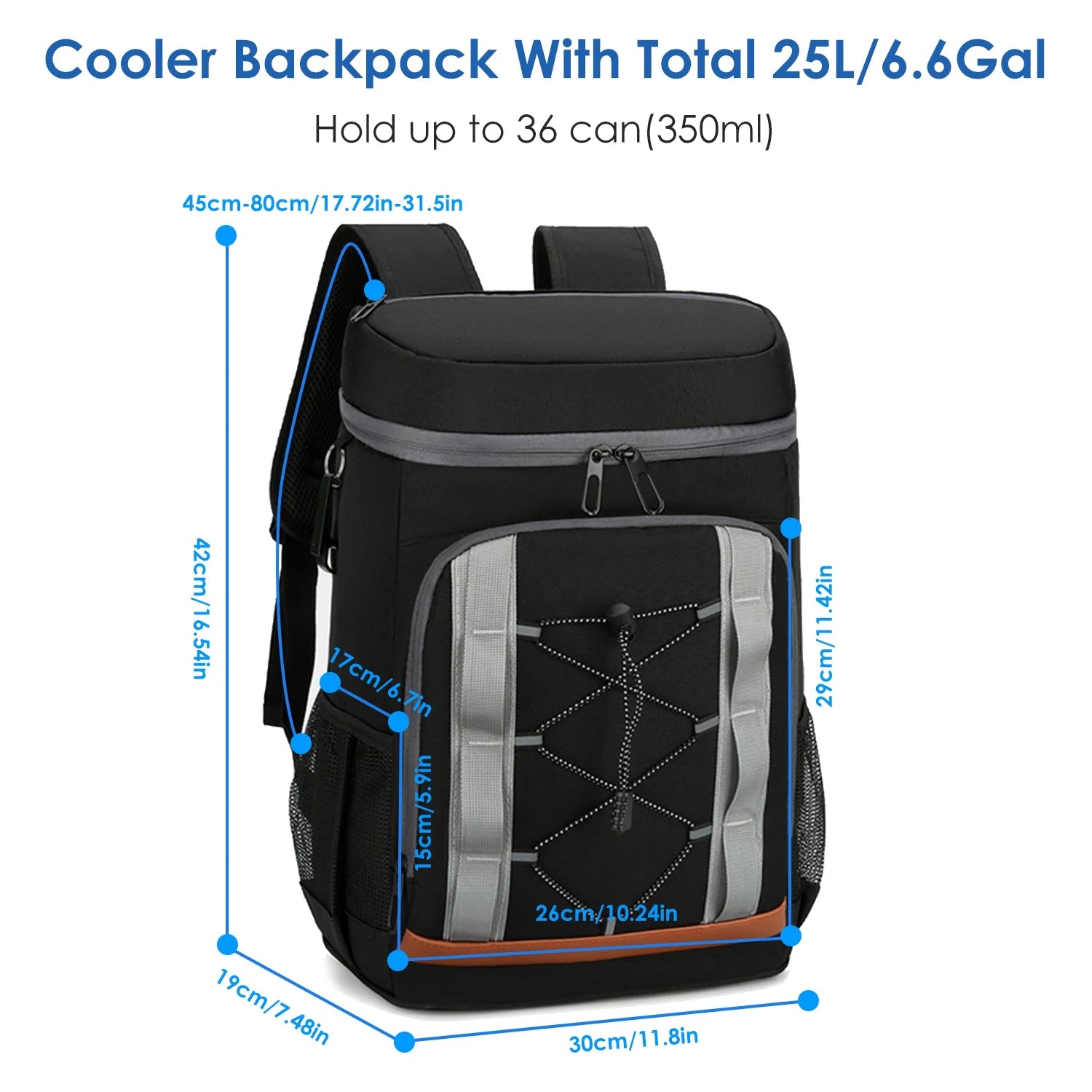 Multi-Pockets & Spacious Backpack: Measures sizes in 11.8x7.48x16.54in, the cooler backpack is able to hold up to 36 Can(350ml). Constructed with a main compartment for fruits, cold beer and beverages, a front zipper pocket for your essential items, 2 side mesh pockets for water bottles and umbrella, and a top mesh pocket with insulated aluminum film for snacks and more.