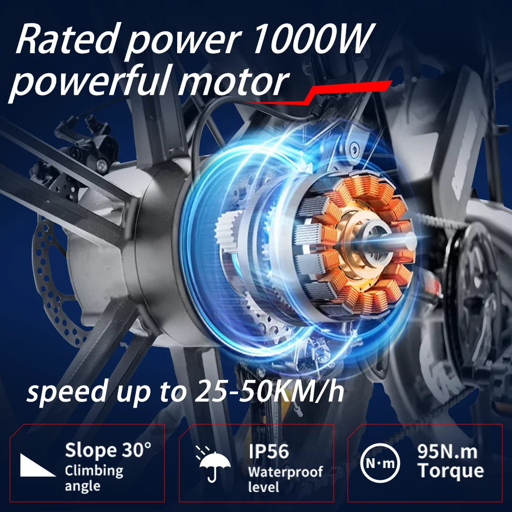 ✅ 1000W violent power: powerful brushless motor, 31mph top speed (about 50km/h), easily conquer steep slopes and mountains.