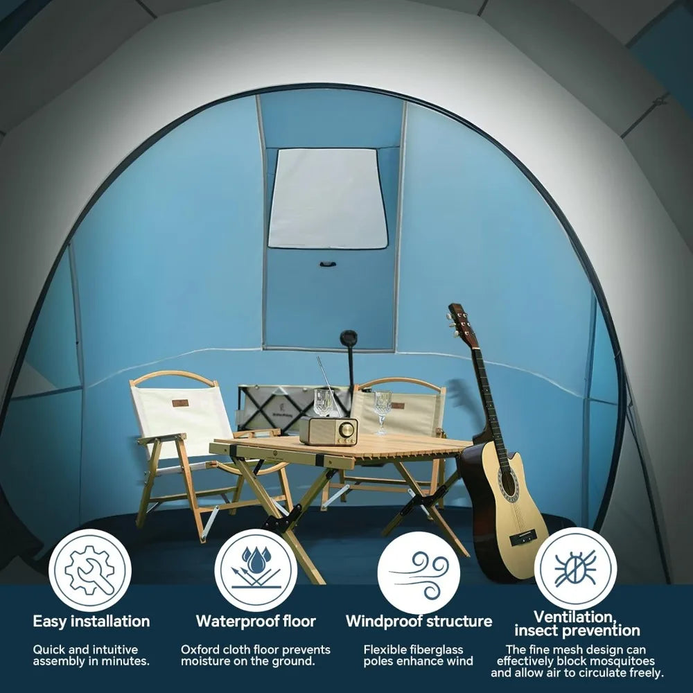 This product is a family camping tent made from sturdy 190T polyester fabric with a PU2000mm coating and fully taped sealed seams, ensuring a waterproof and comfortable environment. It features fiberglass poles for added stability and durability. The tent is designed with two separate bedrooms and a central living area, providing ample space for sleeping, socializing, and storing gear. The overall dimensions of the tent, including the porch, are 177.2 x 86 x 70.8 inches. The tent offers an expandable living space where the vestibule can be used as a sheltered area for outdoor activities such as dining, cooking, socializing, or storing equipment. The central living room can be furnished with camping chairs and inflatable mattresses for a comfortable relaxation zone, perfect for reading, napping, or enjoying the serenity of nature. For optimal ventilation and breathability, the tent is equipped with a mesh window, two side vents, and two D-shaped doors, allowing you to enjoy the view and fresh air. The high-density mesh ensures good airflow, and the high-quality two-way zippers allow for easy adjustment of airflow and temperature, promoting a restful sleep. The multifunctional porch tent provides 70% more outdoor space compared to a standard 4-person tent, serving as a living area to relax and store gear. It also functions as a sunshade canopy, offering ample shade on hot days with good ventilation and clear views, enhancing your outdoor experience.