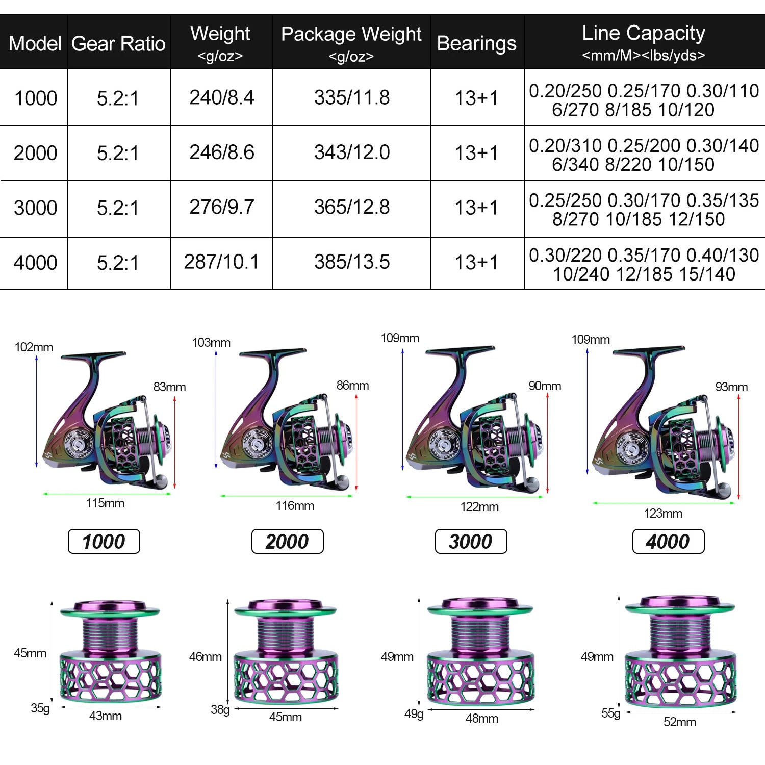 Fishing Reel Colorful Alum Spool Ultra Smooth Light Weight Spin Reel 13+1 BB for Carp Bass Trout
