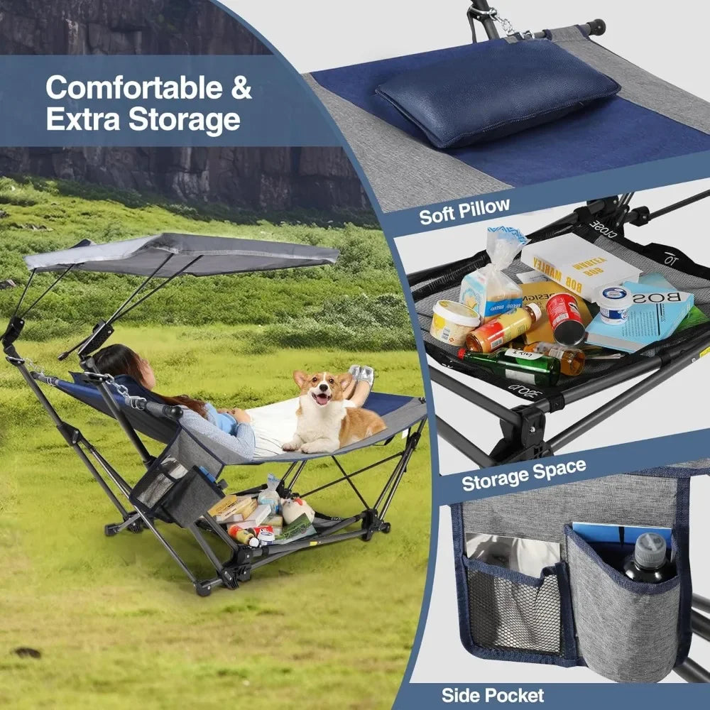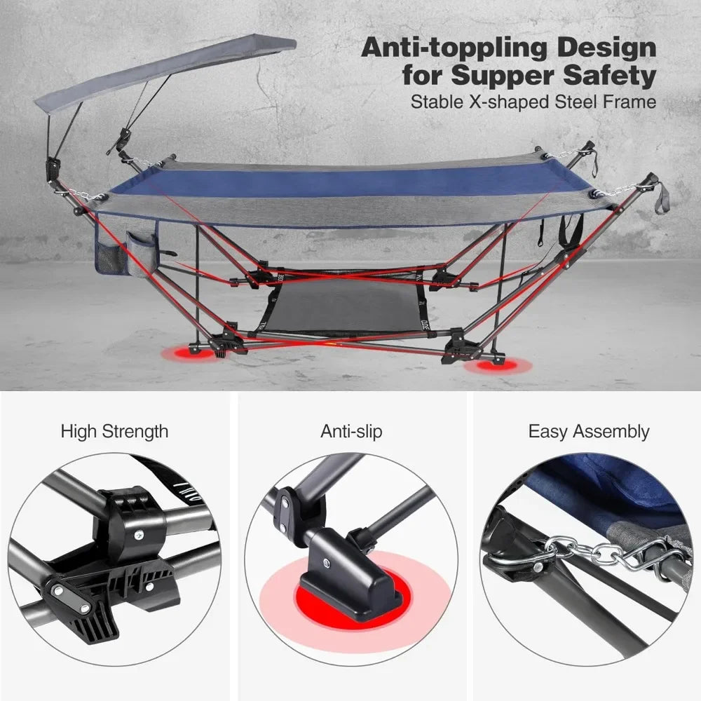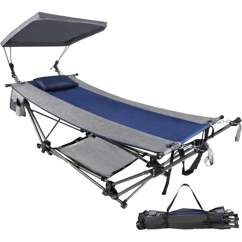 Folding Hammock, Removable Canopy,Pillow, Freestanding, Collapsible Stand for Outdoor Yard Beach