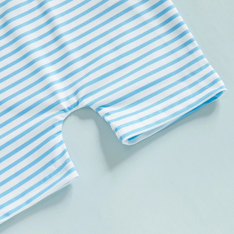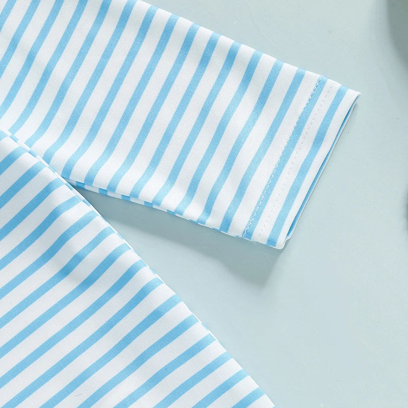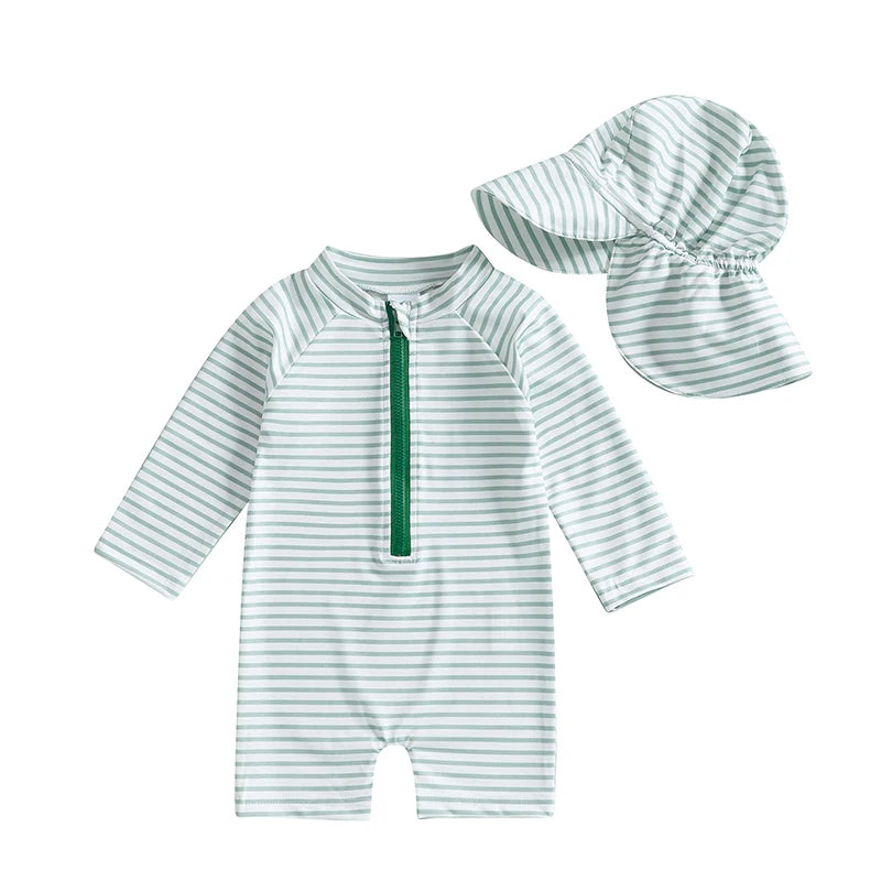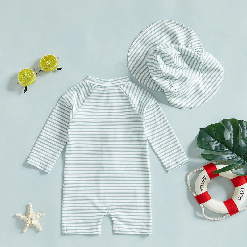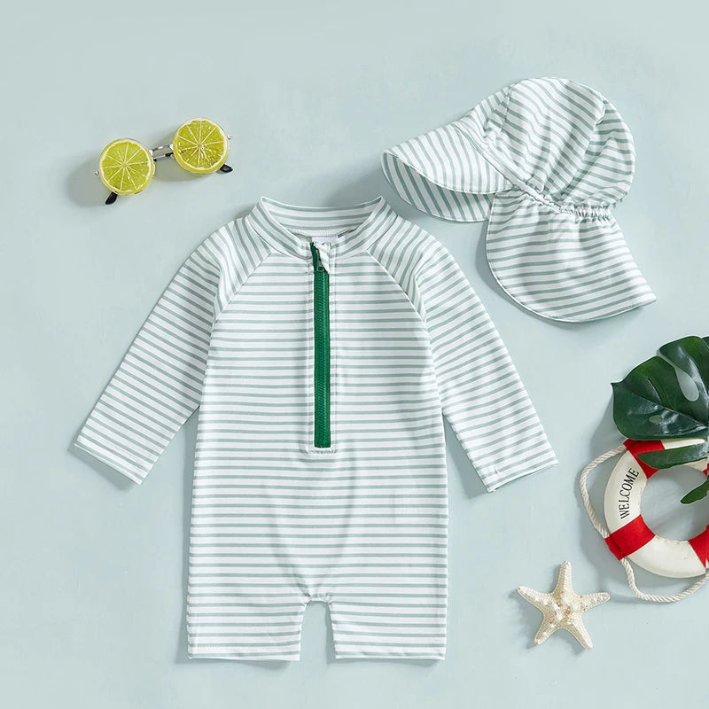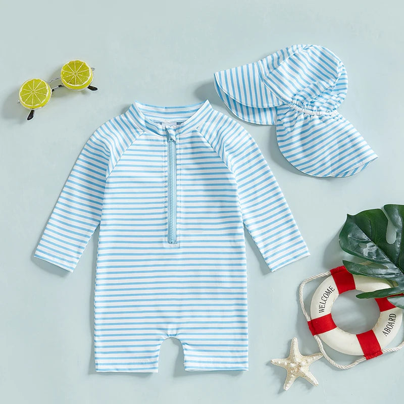 Toddler Boys Girls Rash Guard Swimsuit with Hat 2 Pcs Set Striped Pattern Zip Up Long Sleeve Crew Neck Baby Swimwears
