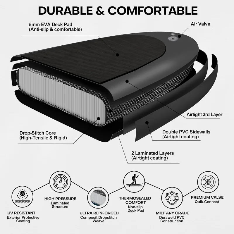 Durable Construction for Longevity: Enjoy a board built to last with a drop-stitch core, airtight double PVC sidewalls, and military-grade materials, all ensuring a high-pressure, rigid platform with UV-resistant and thermosealed comfort. It provides greater buoyancy and sufficient area to support standing or sitting, and won't deform easily in the water even under heavy load.