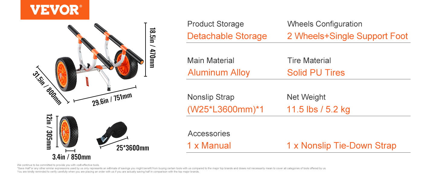 Strong Weight Capacity: This compact kayak trailer is specially designed for transporting various kinds of kayaks. It adopts a 2mm thickened aluminum alloy frame for a larger load capacity. It can carry 450 lbs / 204 kg kayaks without breaking or deforming.
