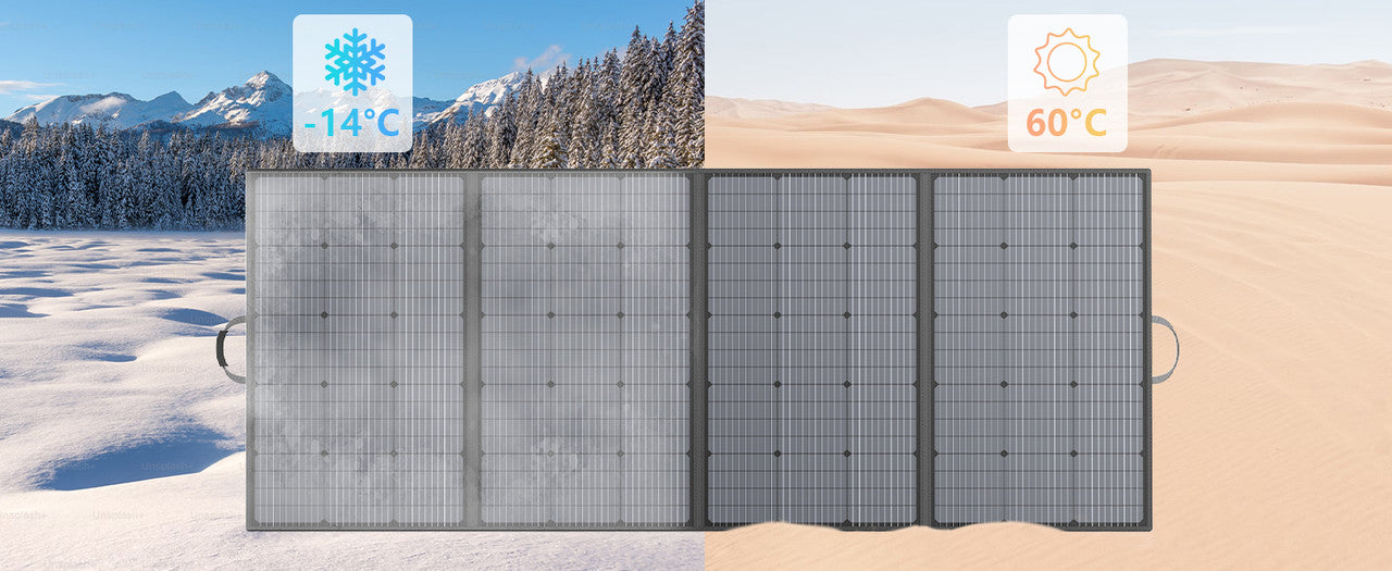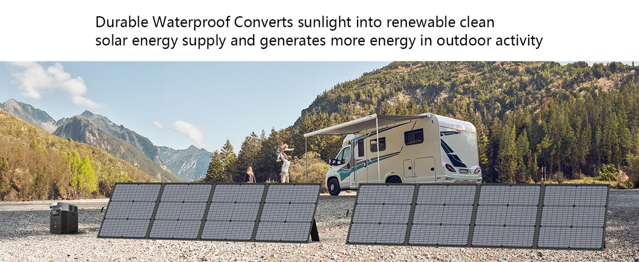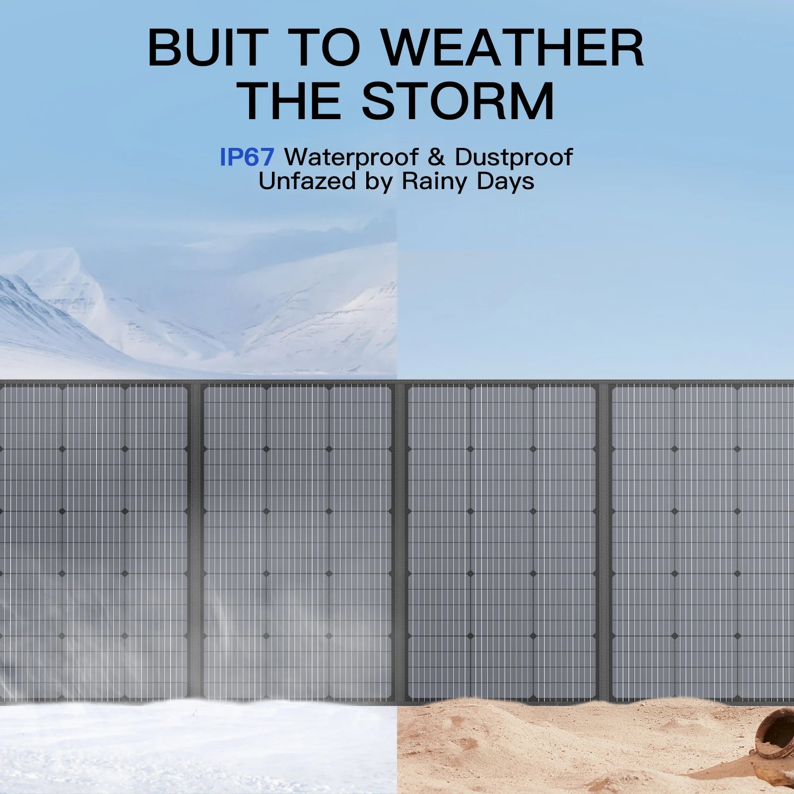 Fast Installation with Kickstands - mhpowos 400W foldable portable solar panel comes with four sturdy and durable Kickstands, the robust foldable kickstands of this camper solar panel enable one-minute installation. Designed for off-grid solar systems, this compact 400 watt solar panel seamlessly connects to most portable power stations on the market via IP67 solar connectors.