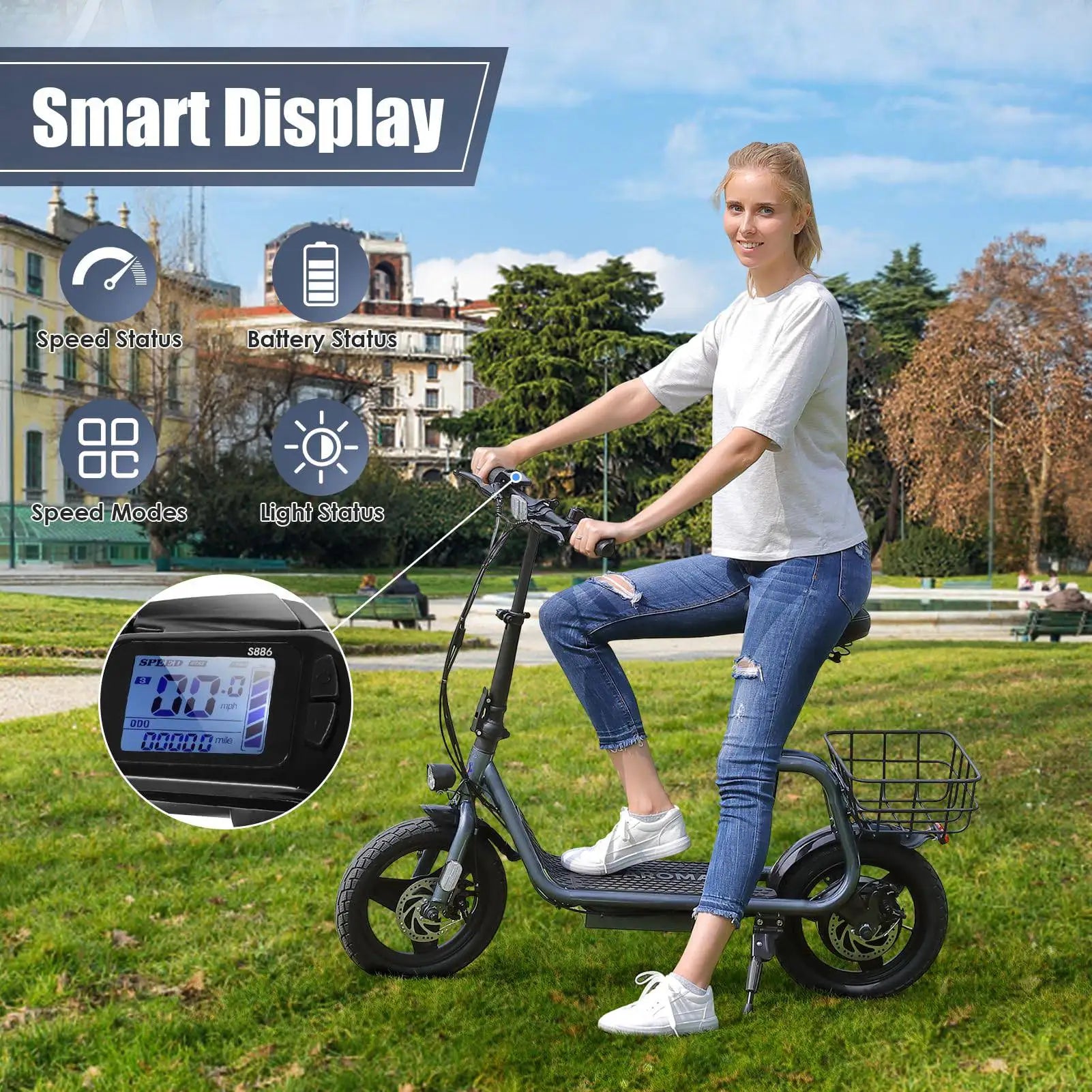 【Design for Commuters】Eletric scooter for adults comes with a basket above the rear wheel, perfect for shopping trips and short errands around the block. Built-in spot headlight makes the road visible and safe to ride at night.