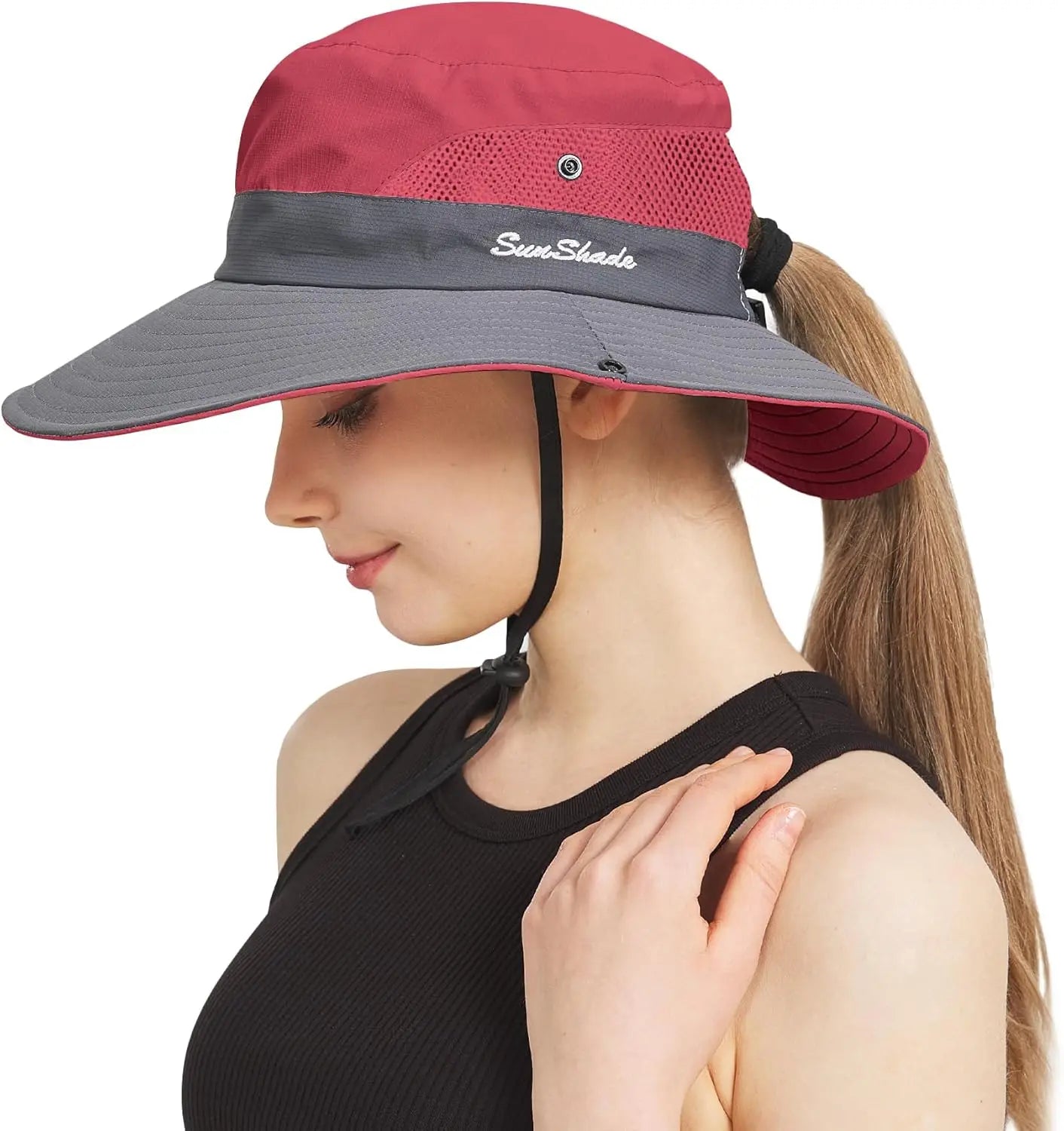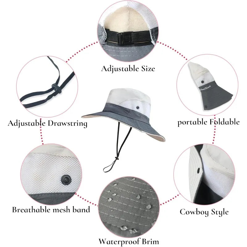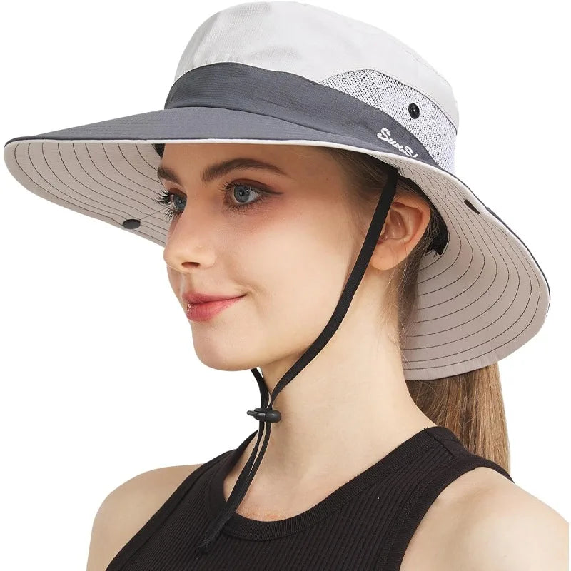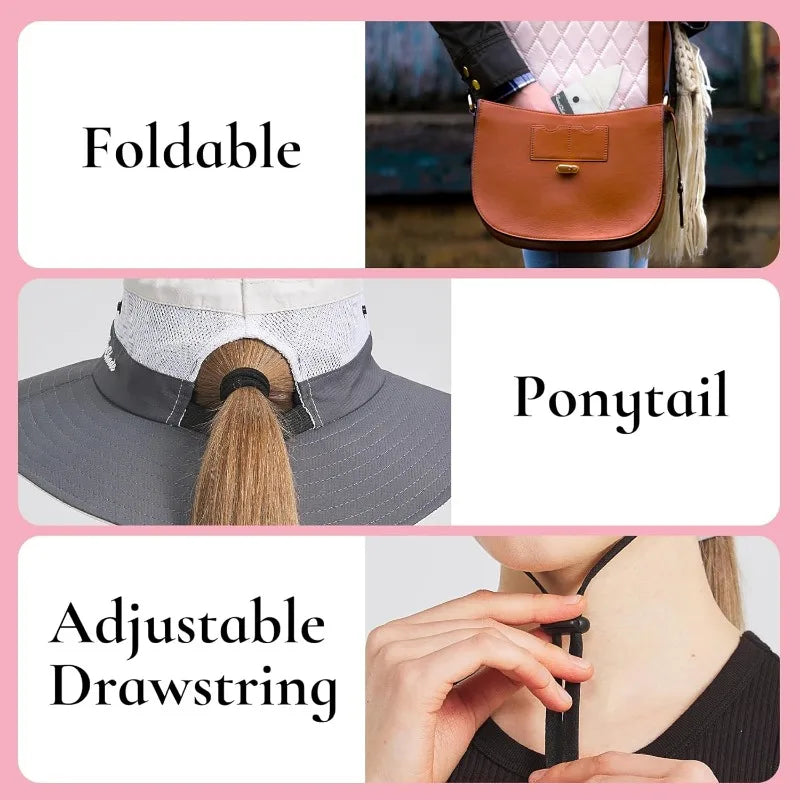 Ponytail sun hat for women with wide brim UPF 50+ fishing and beach