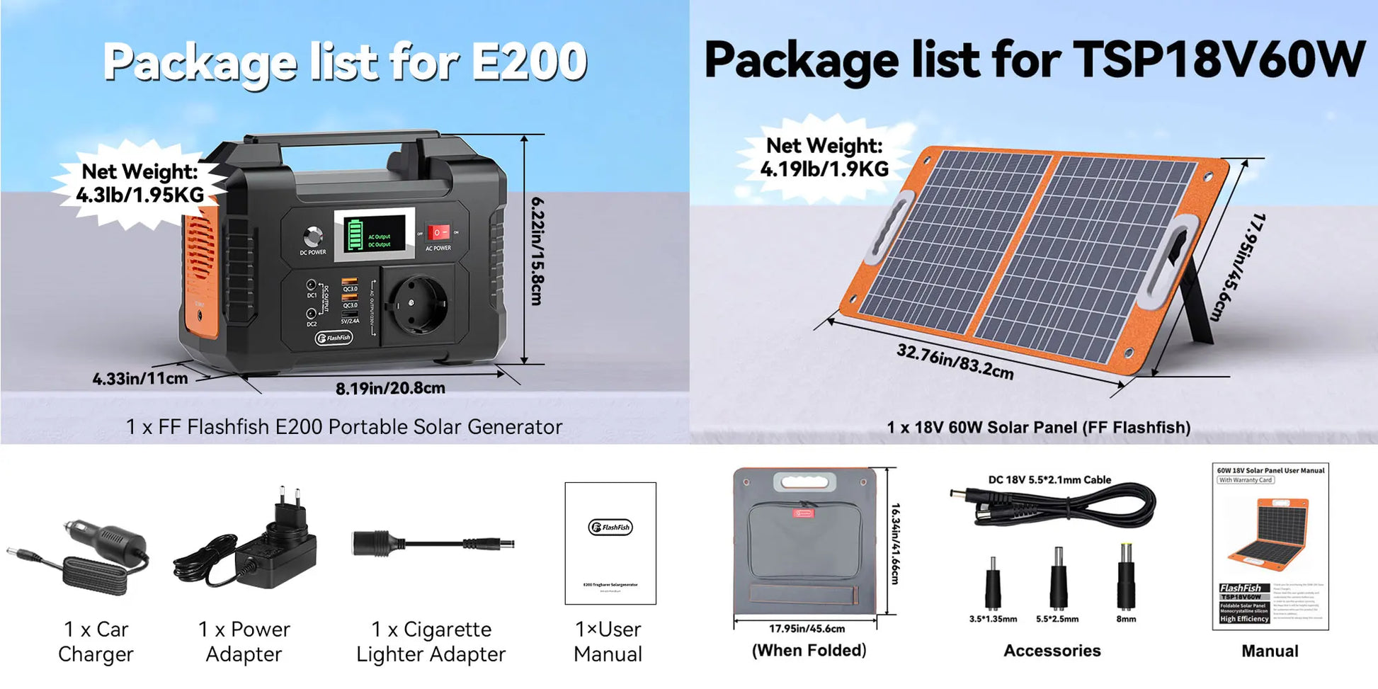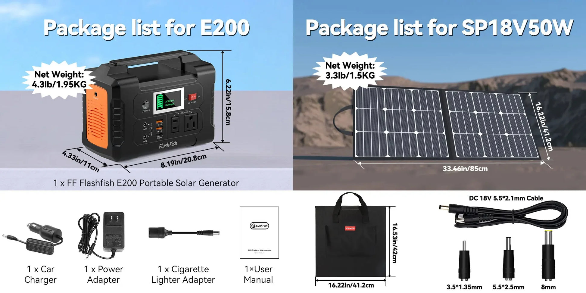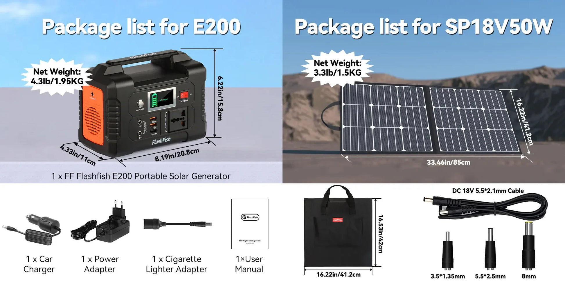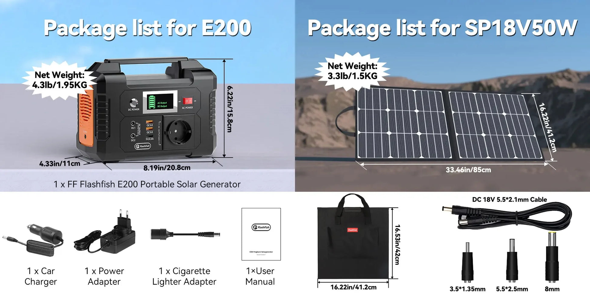 FlashFish power station is equipped with a lithium battery pack, it can be charged by the 15-24 volt solar panel (not included), AC wall adapter and car charger efficiently. No memory effect, no worry about battery capacity reduction.