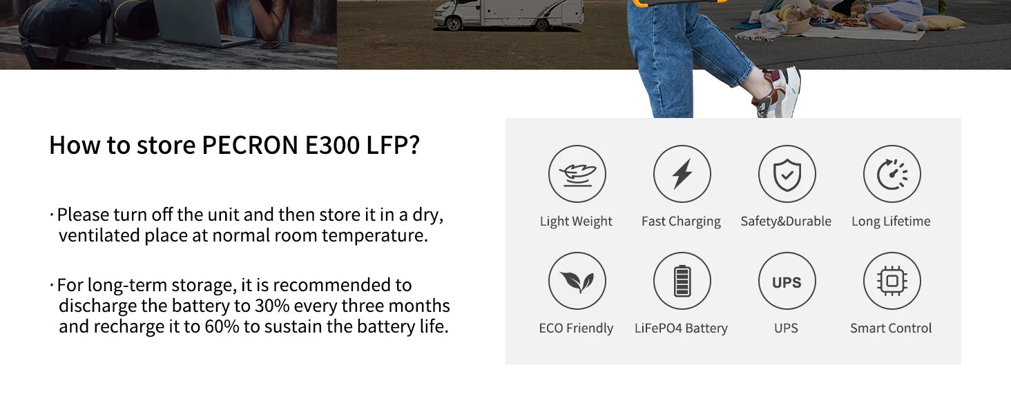 A:E300LFP portable power station utilizes a high-quality UL-certified automotive LiFePO4 battery, it can retain 80% of its original capacity at 3500 complete charge cycles.