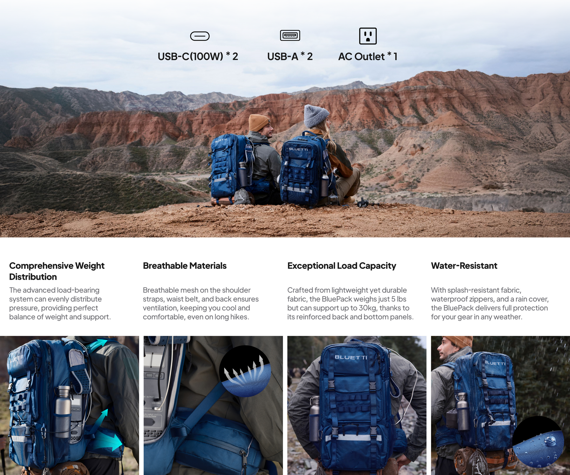The backpack's quick-access side opening are perfectly aligned with the power output ports, allowing easy charging on the go. Meanwhile, the U-shaped opening is designed for optimal ventilation, so you can charge safely and conveniently without worry about overheating. An ideal companion for outdoor photography, camping, hiking, climbing, etc.