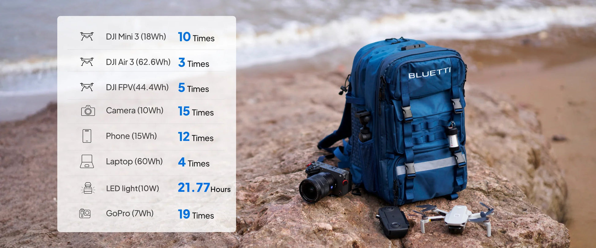 Charge up to 5 devices simultaneously, including your drone, controller, camera, smartphone, and laptop. With extended battery life, you can stay powered up and ready for action without the hassle of waiting in line.