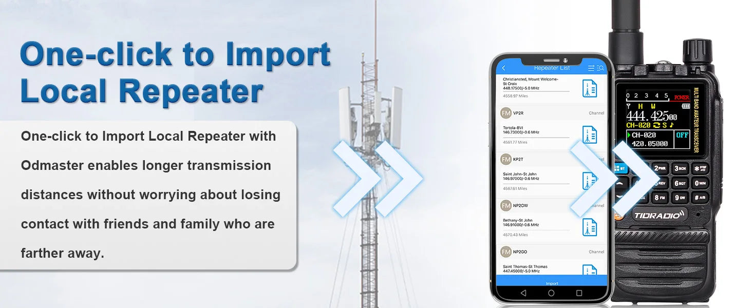 Use the mobile app Odmaster to import local nearby repeaters with one click for longer transmission distance.