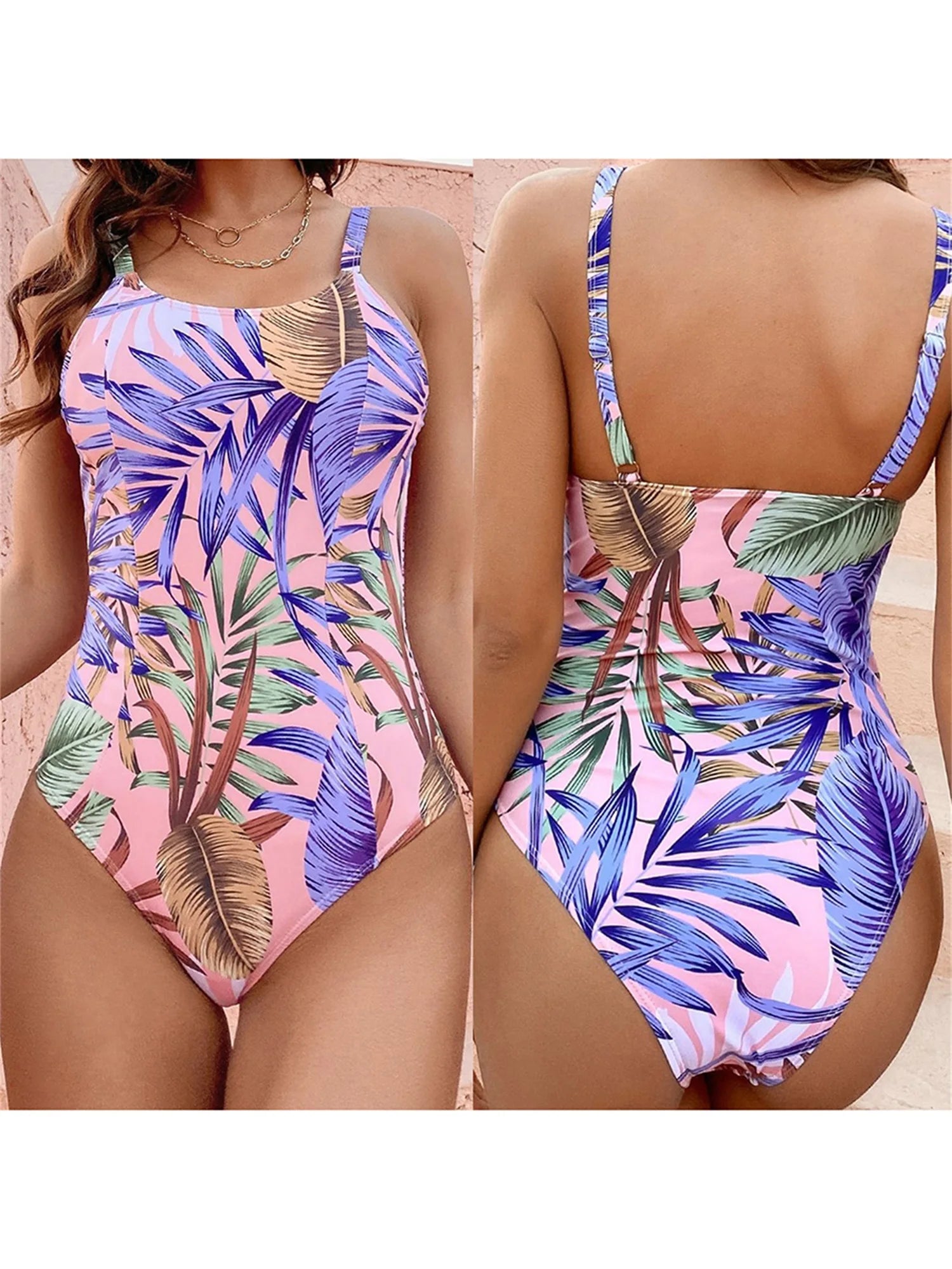 Women's Summer Romper Swimwear Sleeveless Leaf Print Bathing Suit Monokini Swimsuit